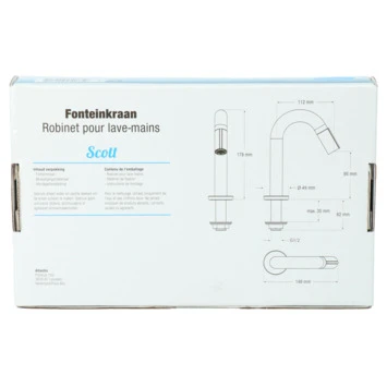 De Atlantic fonteinkraan Scott met draaiknop Chroom bestaat uit een chromen fonteinkraan van 17,8 cm hoog, bevestigingsmateriaal en montagehandleiding. De kraan heeft een diepte van slechts 11,2 cm en is daarmee uitermate geschikt voor gebruik in het toilet. De Scott fonteinkraan zet je open met de draaiknop op het uiteinde van de kraanuitloop. Aan de anti-kalk perlator hecht kalk zich moeilijk vast en veeg je er gemakkelijk met de hand af. De ronde c-vormige kraan heeft een glanzende chromen afwerking. Gebruik alleen water en een zachte doek om de kraan schoon te maken. Gebruik geen schurend, bijtend, azijnhoudend of agressief schoonmaakmiddel. Op de kraan heb je 5 jaar garantie.Â