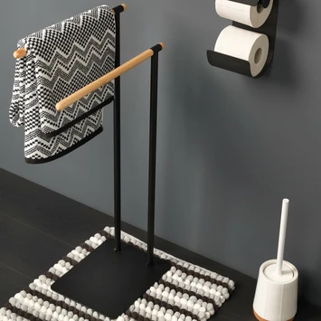 Het Sealskin Handdoekrek Brix Metaal Zwart is een handig dubbel handdoekrek voor in je badkamer. Aan de 2 standaarden hang je gemakkelijk 2 handdoeken op. Met de afmeting van 79,5 cm hoog, 43 cm breed en 24 cm diep past dit vrijstaande handdoekrek in vrijwel iedere badkamer en je hebt geen boorgaten nodig om het te installeren. Bovendien kun je het altijd neerzetten waar jij het wil. Dat biedt je een hoop flexibiliteit. De prachtige houten accenten in combinatie met de zwart metalen basis geven een robuuste uitstraling en passen in een landelijk of industrieel interieur. Op het rek krijg je 1 jaar garantie. Het is wel belangrijk dat je de set regelmatig schoonmaakt met een vochtige doek: zo heb je lang plezier van jouw handdoekhouder. In de Brix-serie kun je ook andere bijpassende producten kopen bij GAMMA.