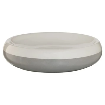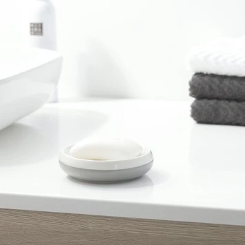 De complete Sphere serie in twee contrasterende kleuren, licht grijs en wit, kleedt je badkamer in één keer aan.