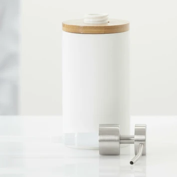 De Sealskin Zeepdispenser Grace Wit is gemaakt uit kunsthars. De afwerking is een combinatie van witte kunsthars en bamboe accenten. Ideaal om een vakantiesfeer te creëren in je badkamer of toilet. Het pompje is handmatig te bedienen en de dispenser is navulbaar. De zeepdispenser is eenvoudig te reinigen met een vochtige doek. Vervolledig deze Grace serie van Sealskin met de bijhorende beker, toiletborstel met houder, tandenborstelhouder en spiegeldoosje.